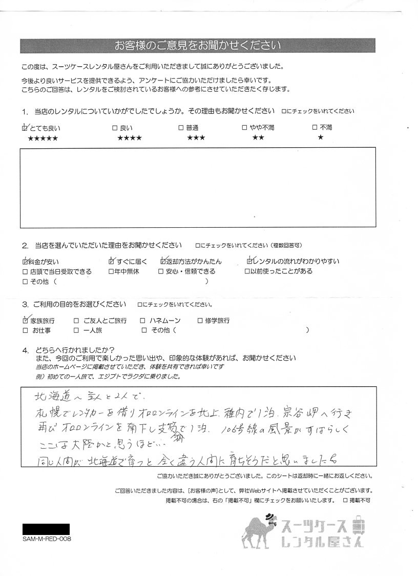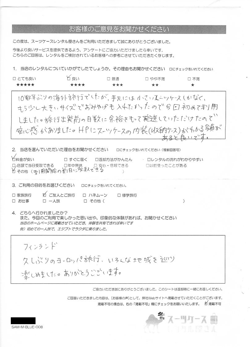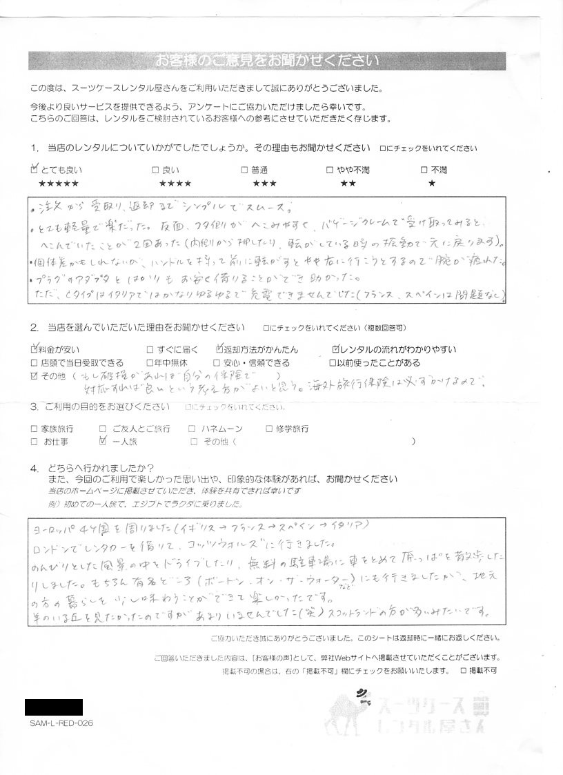 スーツケースを気軽にレンタルでき、返却方法もシンプルで良いと思いました。