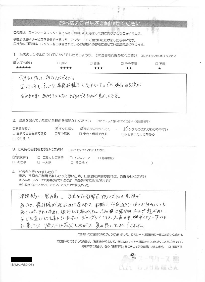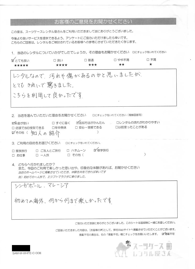 初めてスーツケースをネットでレンタルしたのですが、まず、サイトが見やすくて、安心してお願いできました。そして、メールや説明の文章も分かりやすく、丁寧でありがたかったです。気持ち良く使わせて頂きました。