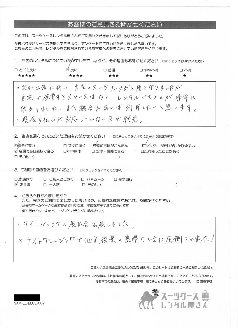 海外出張に伴い、大型のスーツケースがレンタルでき非常に助かりました